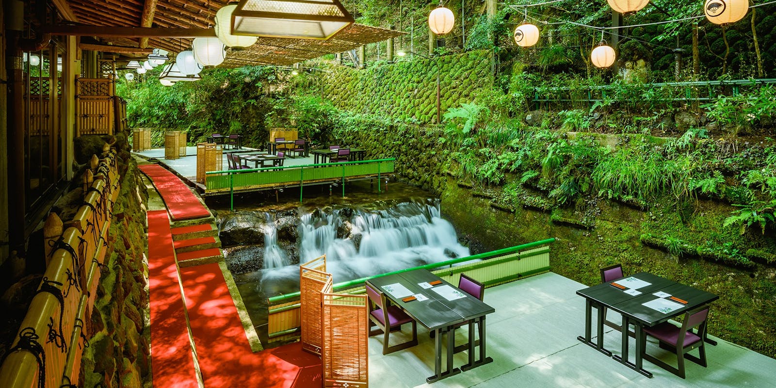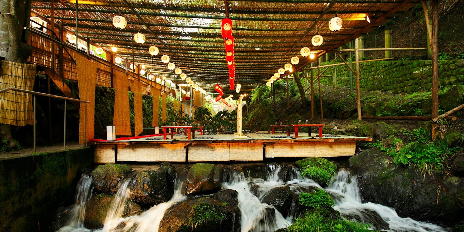 高雄の川床は清滝川沿いに設置された桟敷席で、自然と一体になれるのが魅力。貴船のように川の上に座るスタイルではなく、川の横にお座席を設け、川のせせらぎを眺めながら食事を楽しむスタイルです。