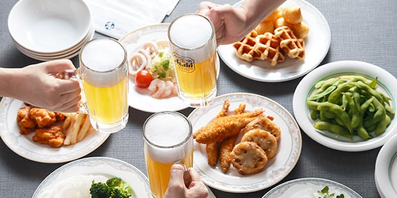 工場直送のキンキンによく冷えた生ビールをはじめ、焼酎、ワイン、ソフトドリンクなどのお飲み物と、鉄板焼きや揚げ物、お惣菜、デザートなどのお料理をお好きなだけお楽しみいただけます。