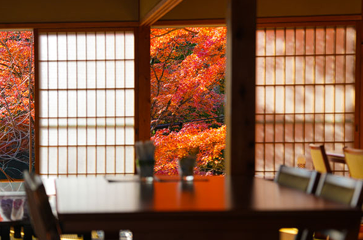 紅葉を眺めながら、お座敷でゆったりスイーツや軽食が楽しめる贅沢なひとときが待っています。